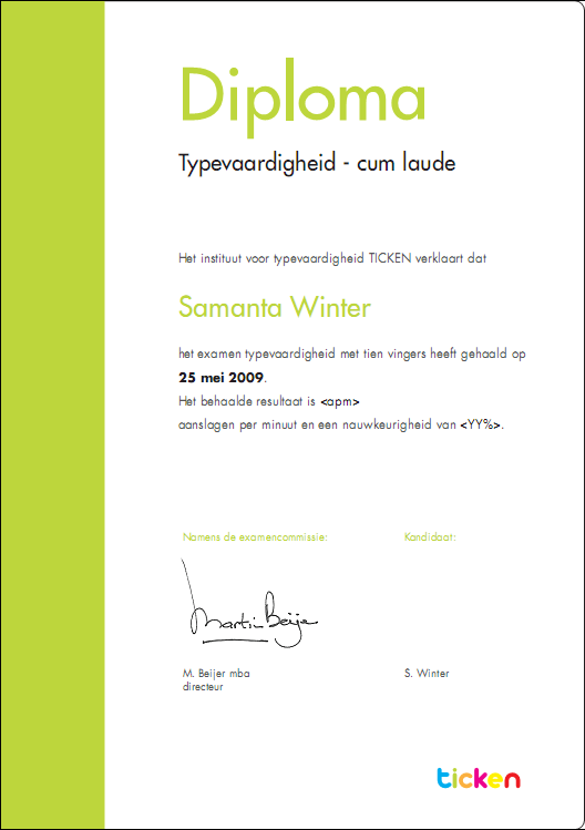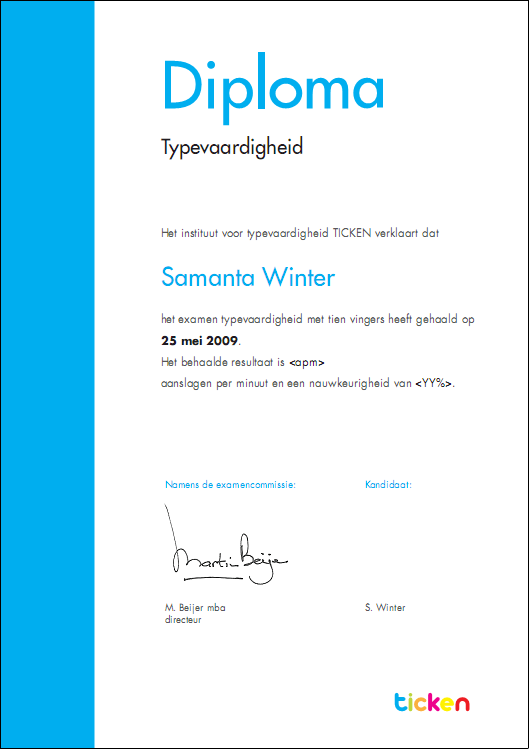 | Diploma Typevaardigheid | Minimaal 100 aanslagen per minuut en maximaal 1% foute aanslagen. |