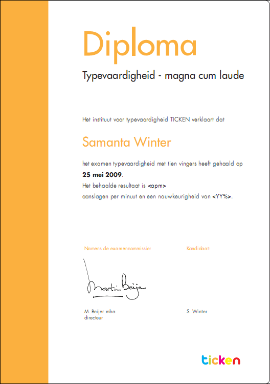 Afhankelijk van je score, ontvang je een van de volgende vier TICKEN Typediploma's: